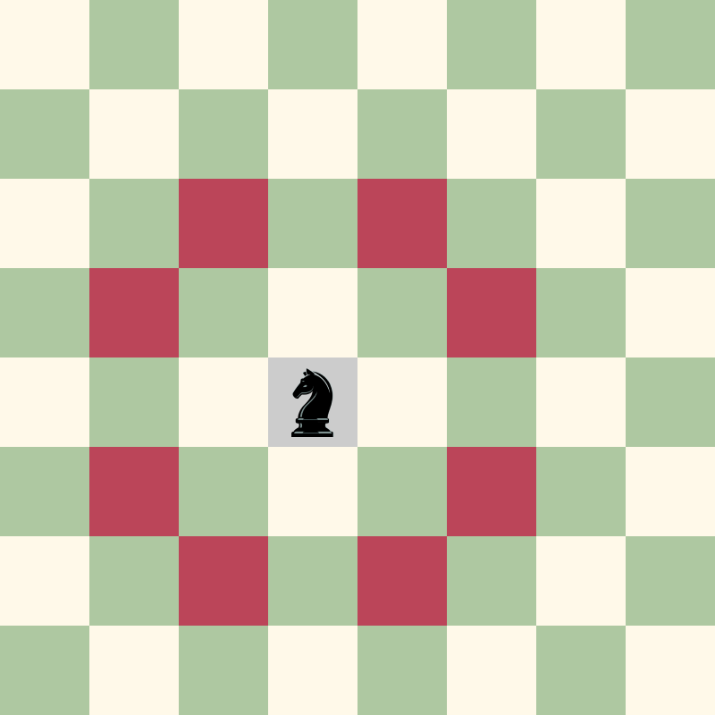 Verán que el caballo sólo se puede mover 8 casillas a lo más, cada turno. Esto nos permite contabilizar más rápidamente la cantidad de configuraciones que se puede obtener con una cantidad de n movimientos (asumiendo que estos movimientos no reducen su movilidad haciendo que i.e. se vaya a una orilla). Con eso en mente, podemos extraer que se va a mover de formas posibles con dos movimientos.